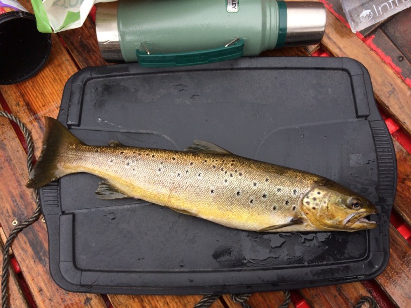 We had barely pulled out of Inchmoan when the outside outrigger buckled and the reel began to screech, yes the one with the white and pink rapala. Like a well oiled pit crew (of two) we were soon playing a decent fish which put up a good fight and displayed none of the behaviours of a Pike. After a short contest a lovely brownie of around 4.5lbs was netted. Admittedly it appeared to initially resemble a sea trout but after some quick discussion we agreed it was a brownie.