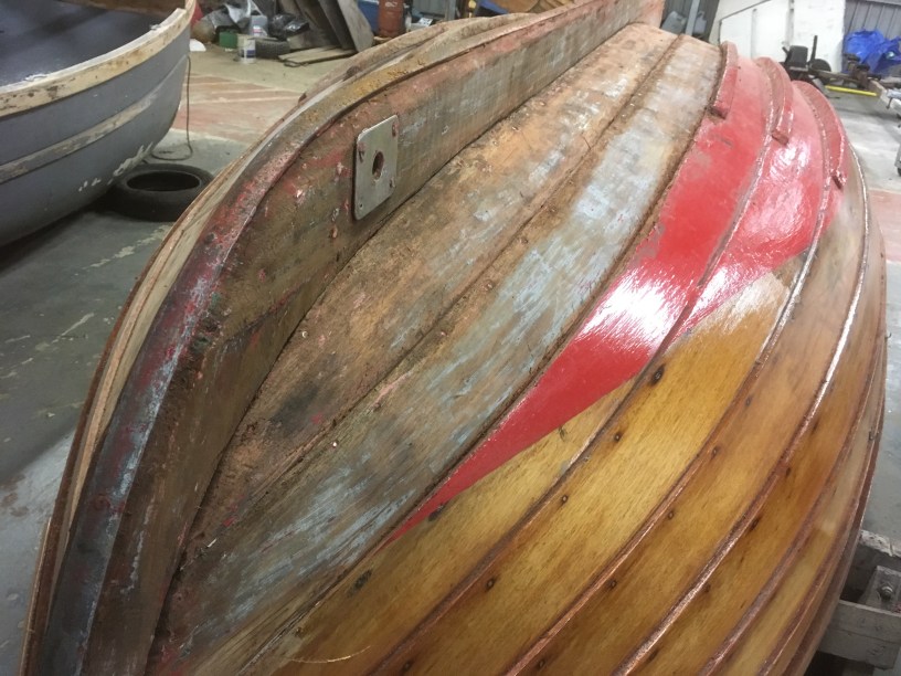 More “Bottom Scraping” today, another 6 hours or so in the workshop but despite the seemingly slow progress I feel that I’m on the home straight at least with regards to getting the hull scraped in preparation for next steps. In addition to the layers of anti-fouling red paint the tedious job of carefully removing all of the old (waterlogged) filler accounted for much of the time spent. Goal one of course is to strip everything back in order to assess condition of timber before deciding next steps. A bit concerned at condition of a few areas of both pairs of inner two planks (adjacent to the keel) where advice will be needed.