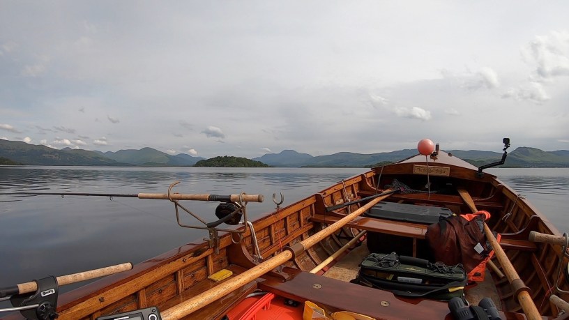 The forecast had said light rain with a ‘moderate’ wind as I headed out onto the Loch buoyed by the recent heavy rains and several salmon being taken from the River Leven earlier in the week. The heavy leaden skies and relative calm conditions provided dramatic scenes as I headed up along Boturich shores fishing as ‘tight’ to shore as I dared. So tight in fact that I lost a lure to the bottom in one of the bays as well as ‘whacking’ the bottom hard several times which certainly got the nerves jangling as I checked that the outboard was still securely attached!