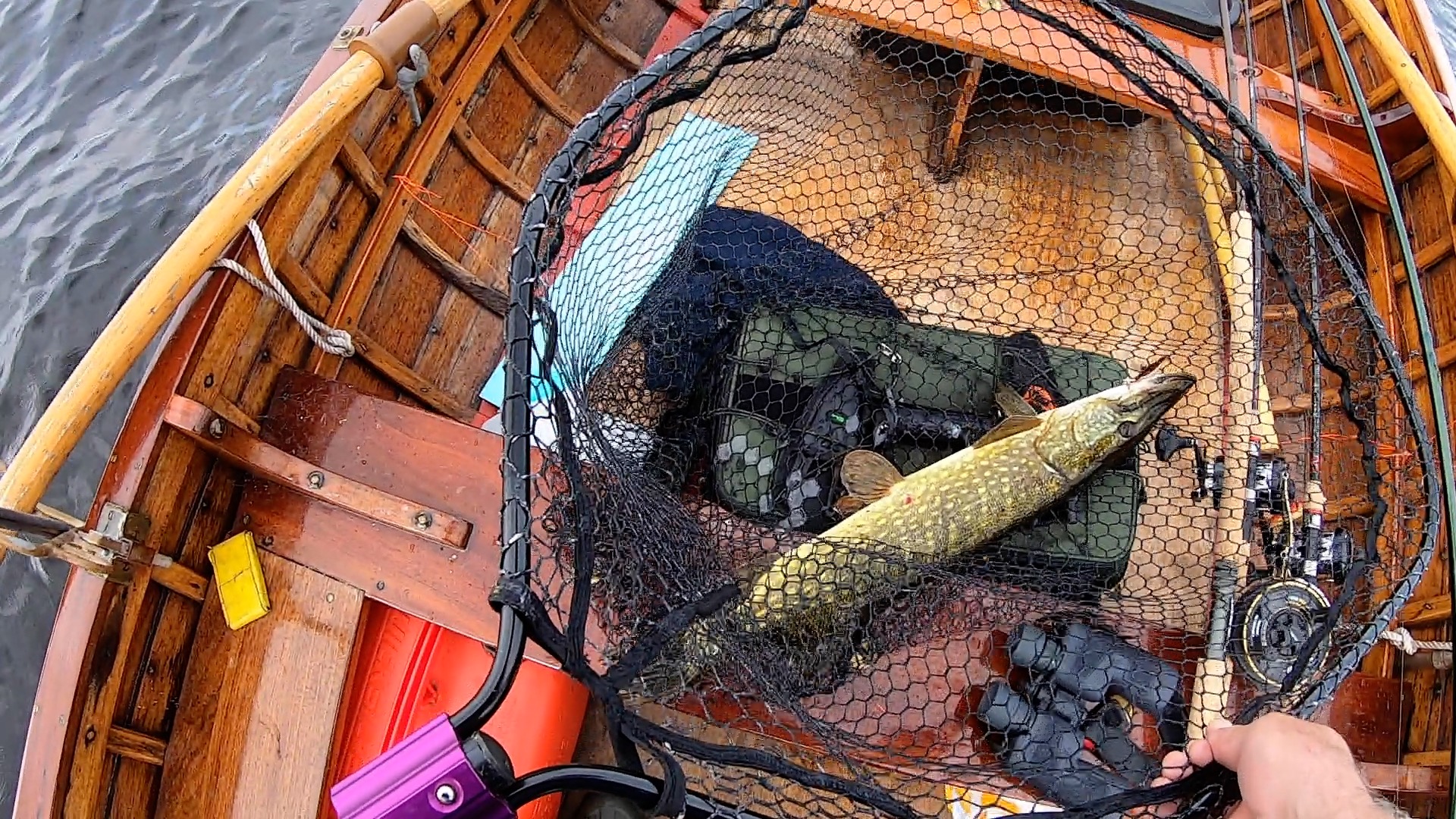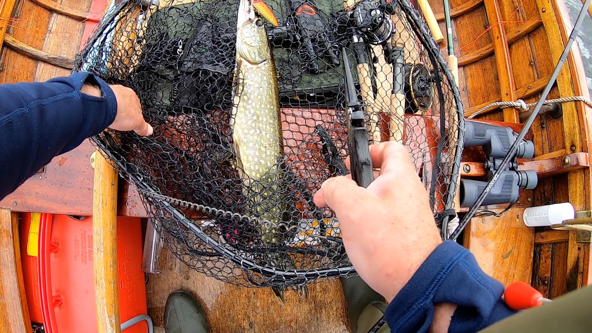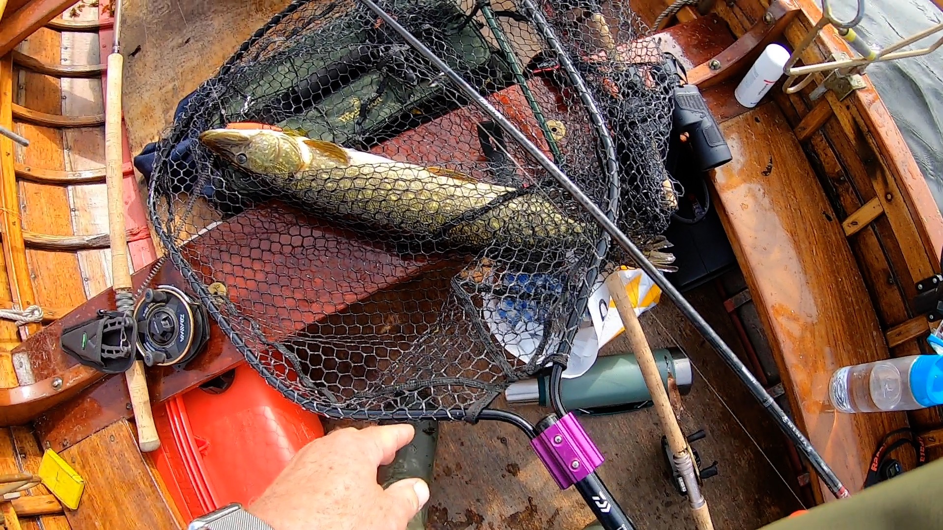 Rods out and reset once more I headed on past Ross Priory with thoughts returning to that cup of coffee. Not a chance as the inside ‘poker’ once again announced a take and I thought ‘fourth time lucky surely!’ . With the boat pitching in the rollers as can be seen I struggled to stand and almost joined the fish at one point before deciding being seated was better option. After a short fight with the fish and the rolling boat another beautifully marked healthy pike of around 12lbs which had fallen once more for the orange Tomic was safely landed and released.