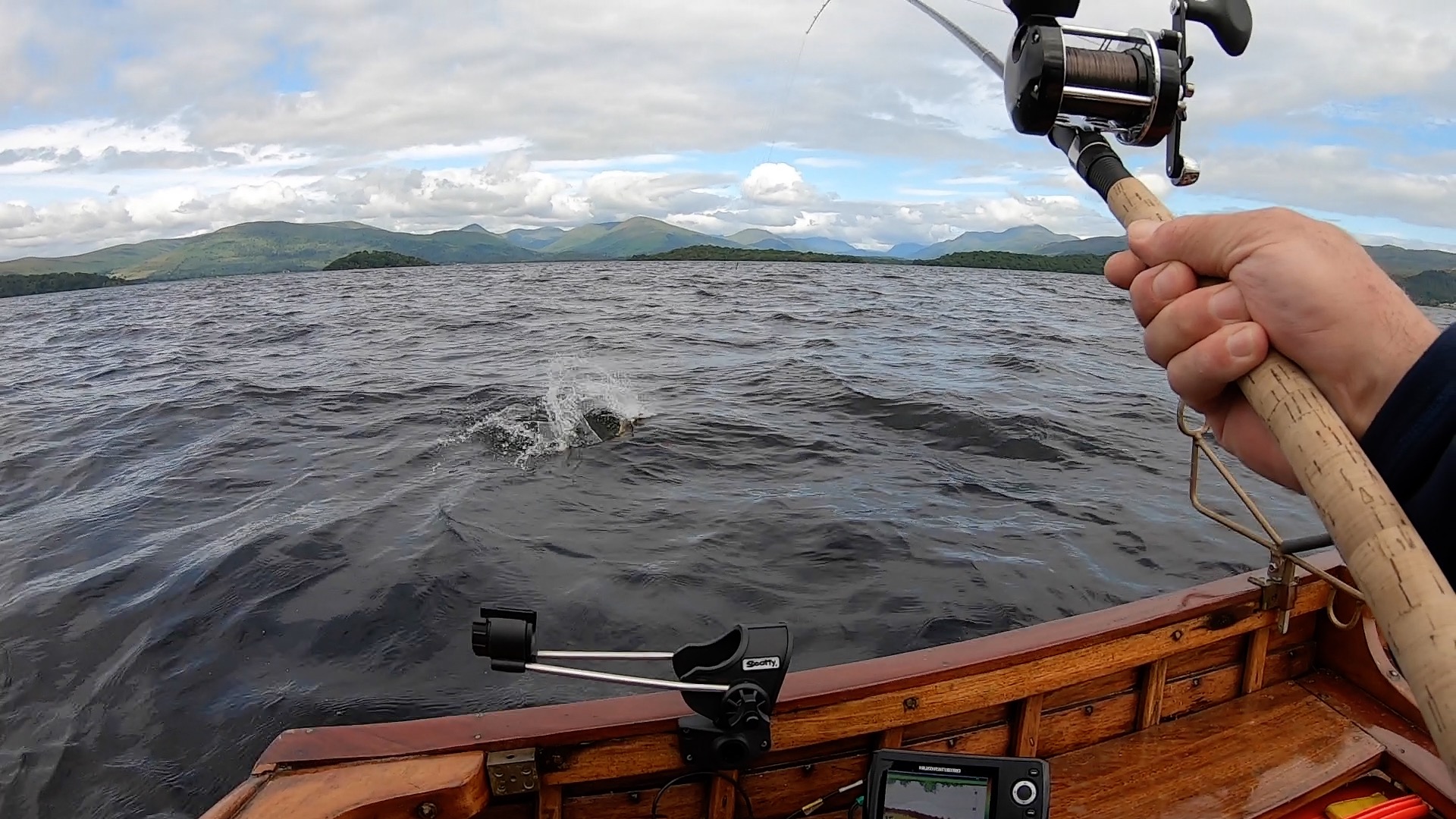 Continuing north along Boturich things had barely settled down when the inside rod buckled with the reel singing as I gathered in the other rods. A good bend in the rod signalled a good fish………alas another pike and not silver! Following some ariel acrobatics a healthy beautifully marked pike again of around 12lb was netted and released returning to the deep once more.