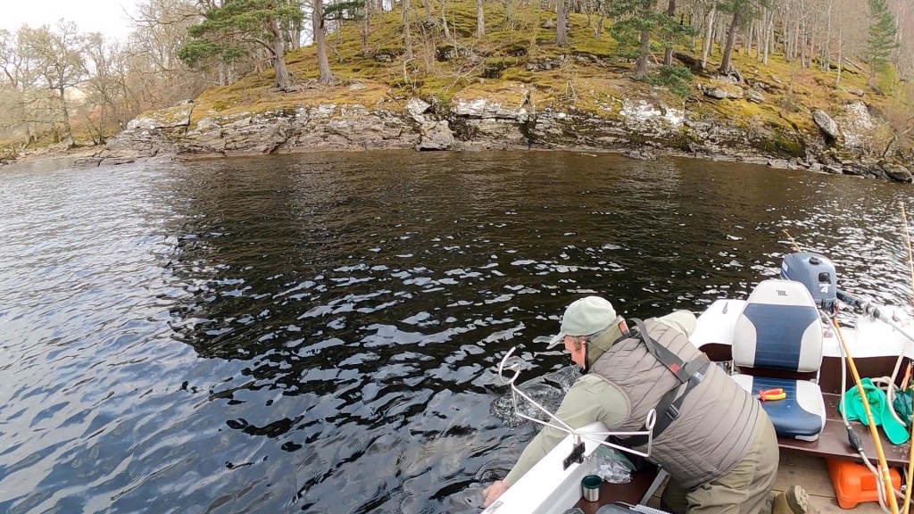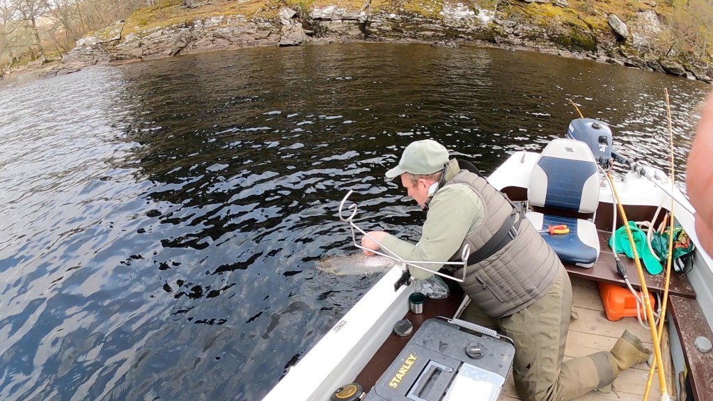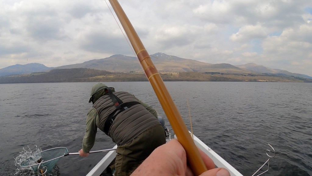 A kind invite by friend and experienced angler John Bell saw us loading the boat and slowly nosing down the river and into the Loch. As we made our way we caught sight of a beaver going about its business and evidence of their ‘woodworking skills’ were clear to see. Our spirits were high despite the decidedly cold conditions and little sign of the forecast light winds.