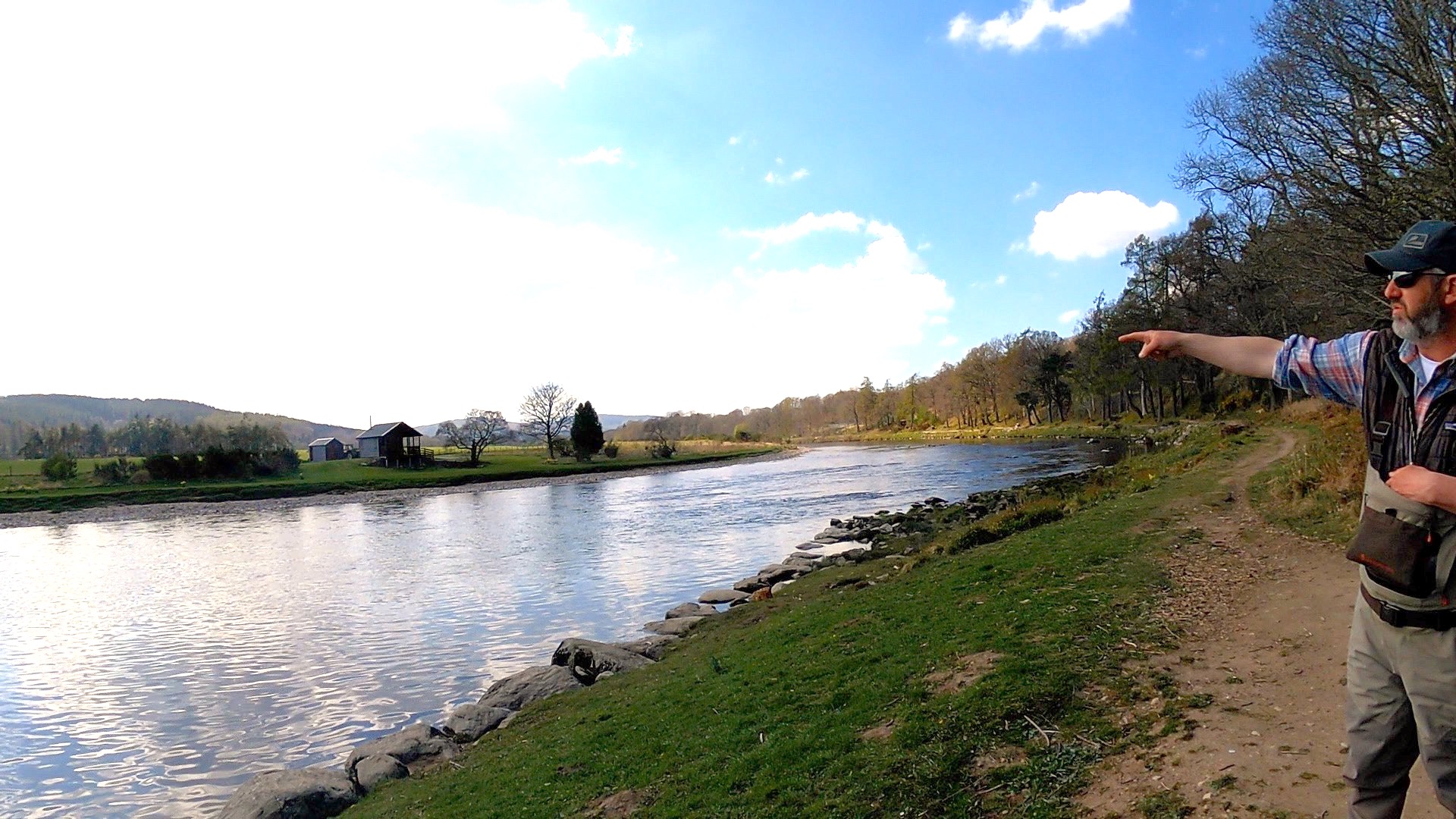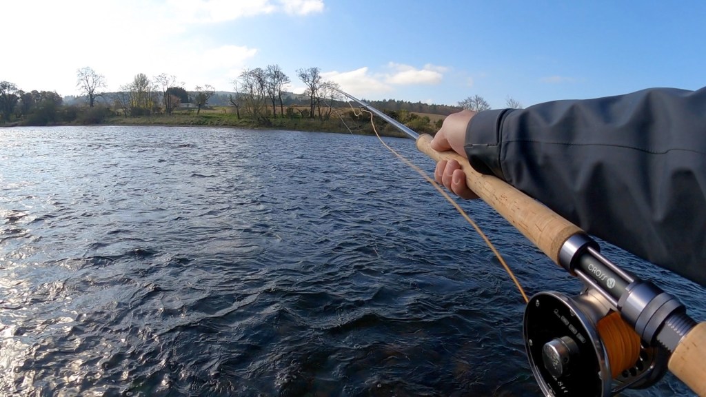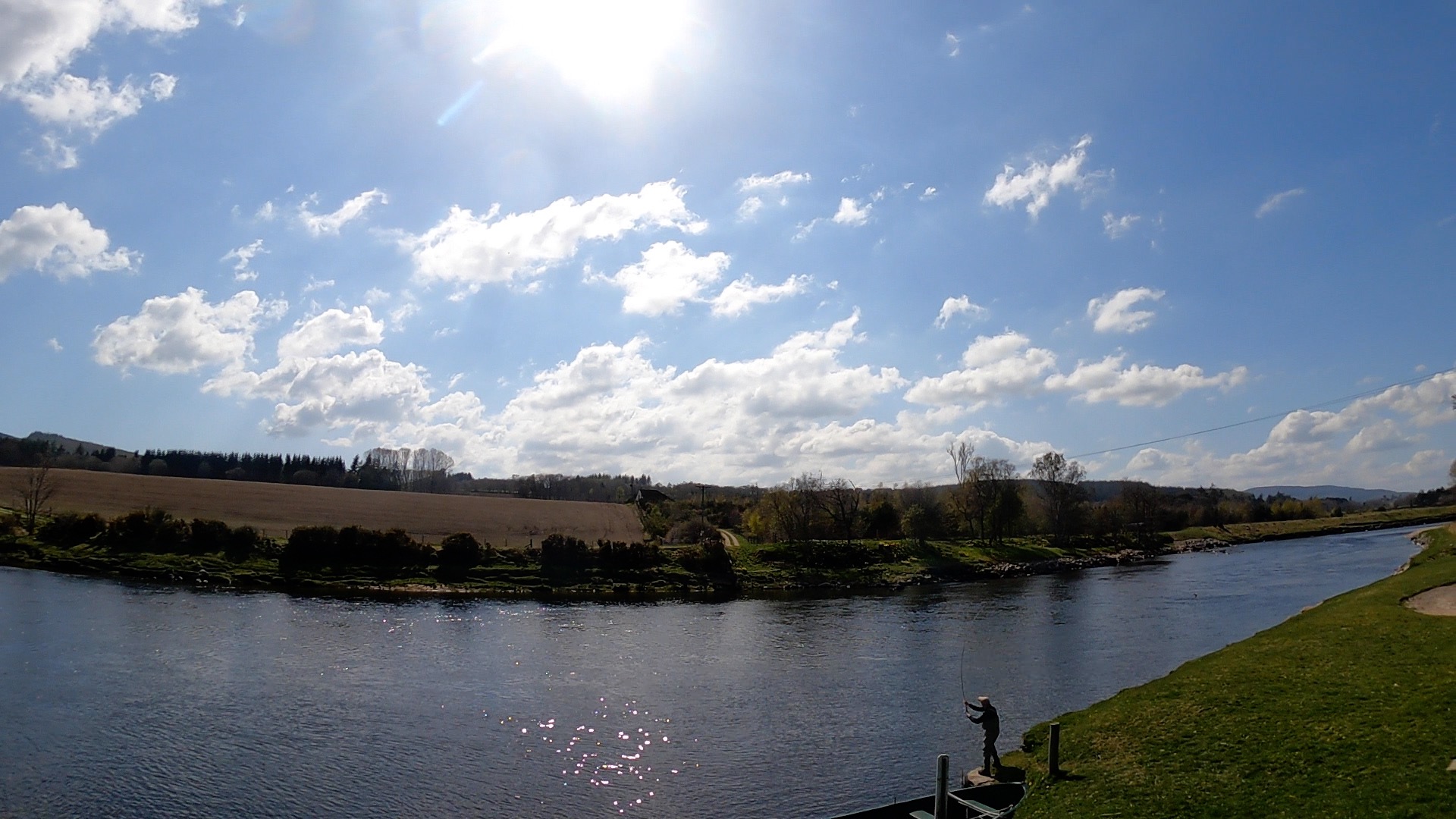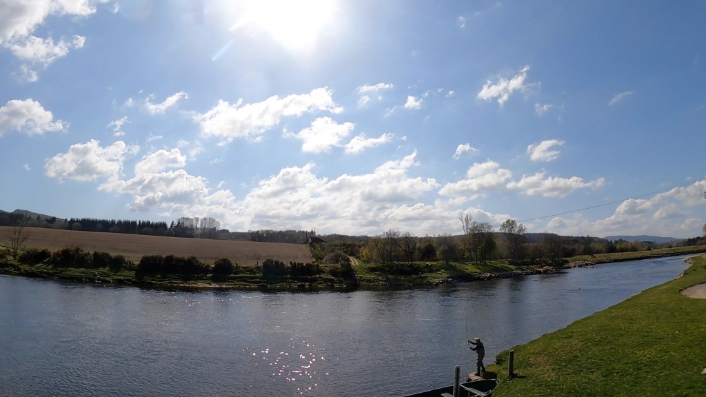I started on the lower part of the beat carefully fishing down amongst the boulders and riffles of the “Crathes Trough” section. The bright blue skies and sunshine showcased the river in all its glory but combined with a chilly north east wind conditions were far from ideal.